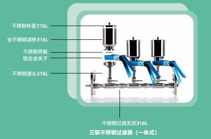 1、在過濾過程中,采用一體化的解決方案,配套無污染的無油隔膜真空泵。整套過濾系統可以在實驗室、潔凈室、超凈工作臺上安全放置和高效操作。